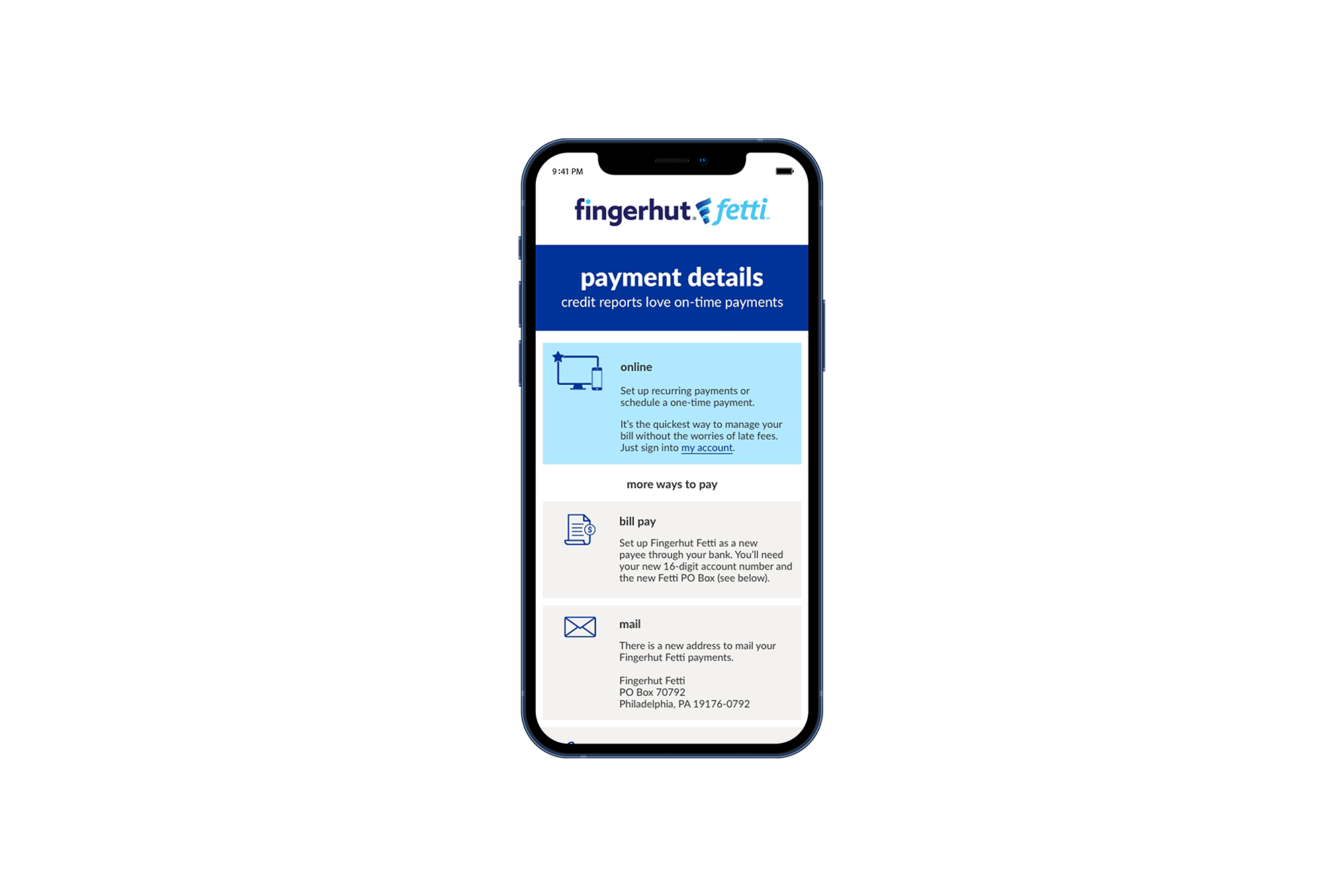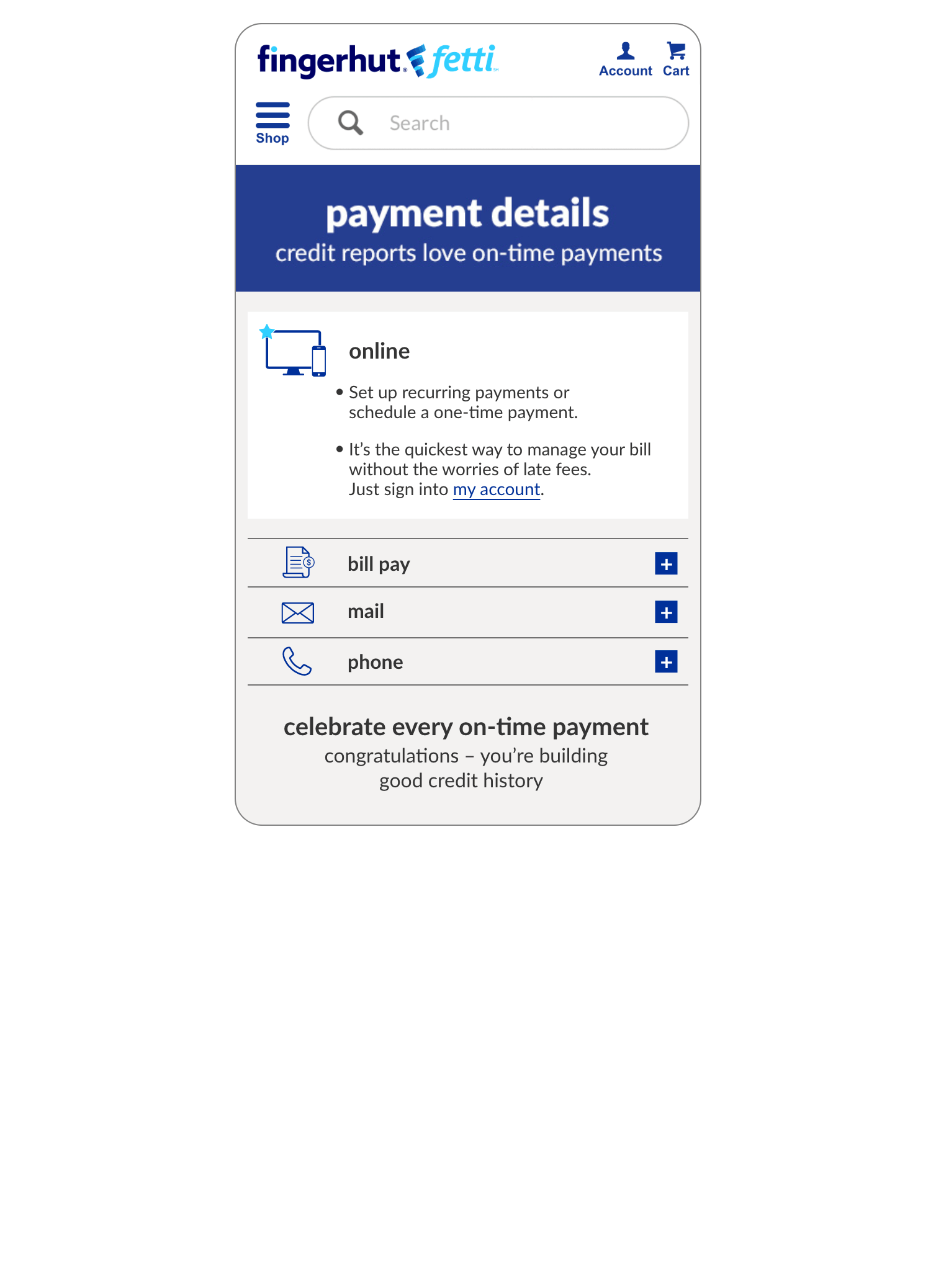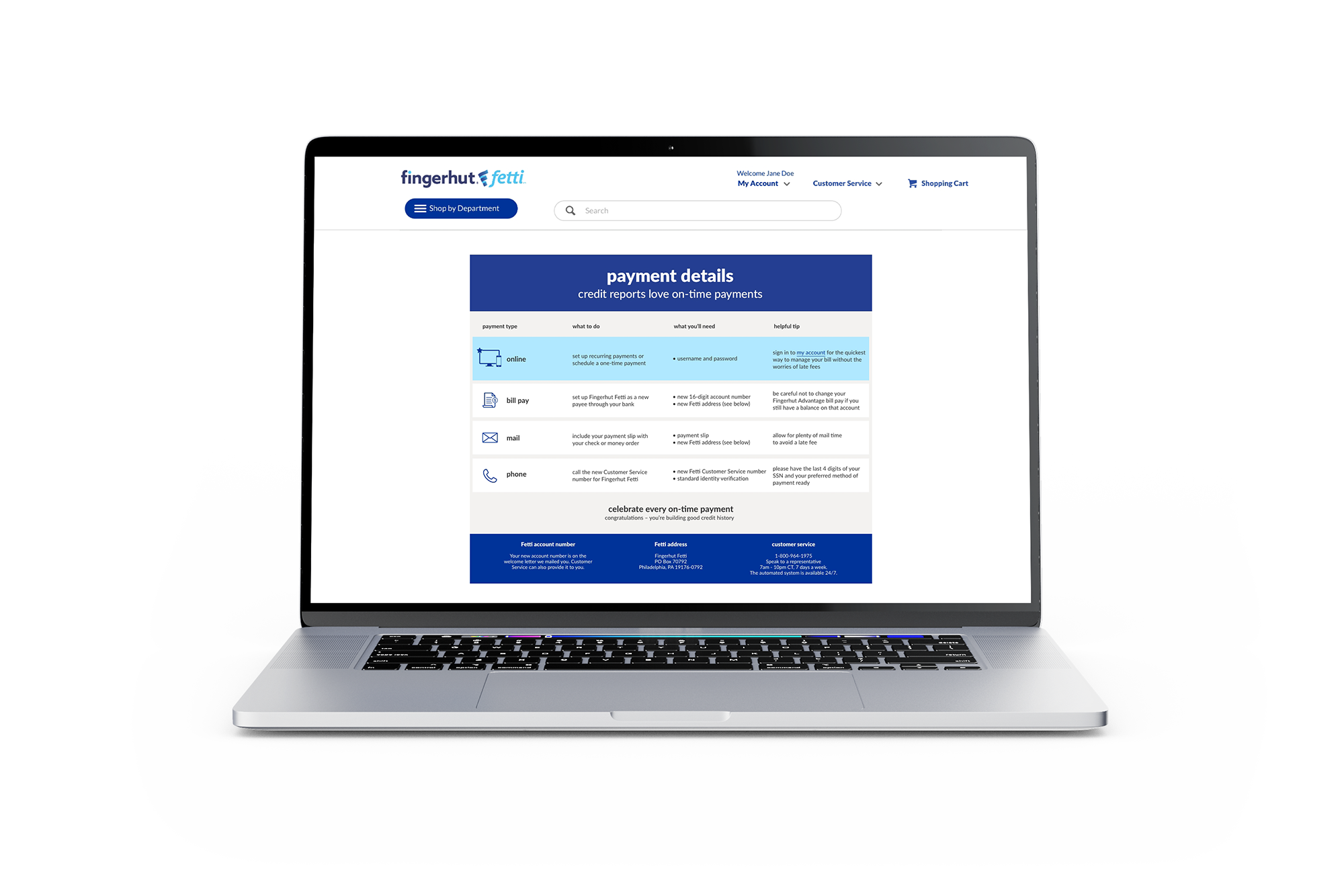 As part of the Fingerhut Fetti refresh, I developed a multi-channel campaign to guide customers through updated payment options for their credit accounts. Given the potential for confusion, the goal was to deliver clarity and confidence, making it easy for customers to understand their options while promoting online and recurring payments as the most reliable choice.