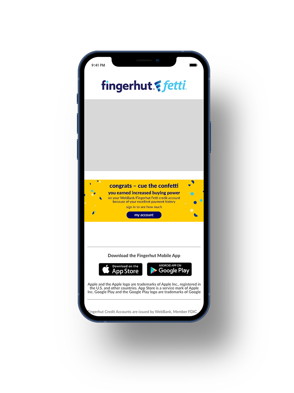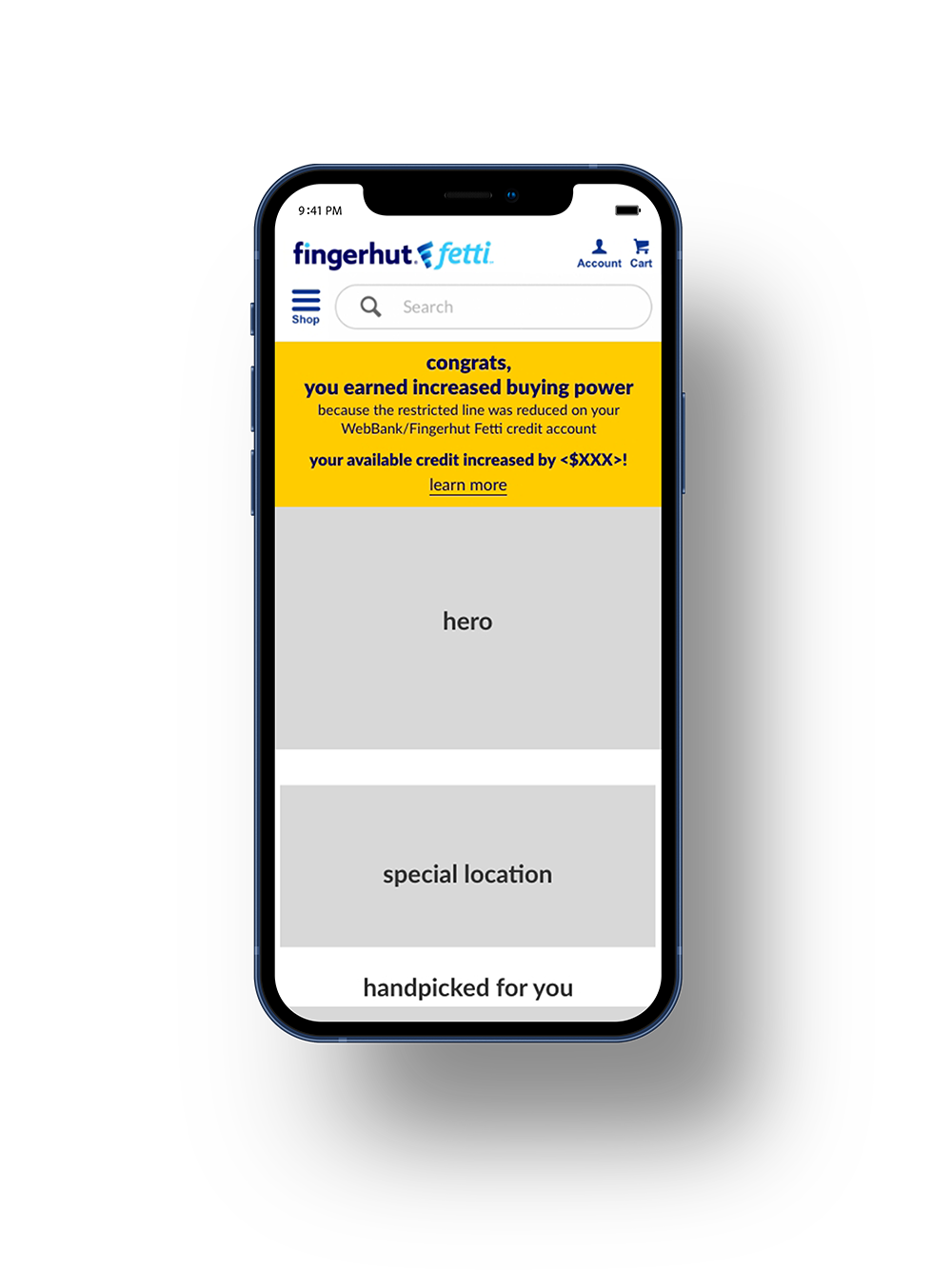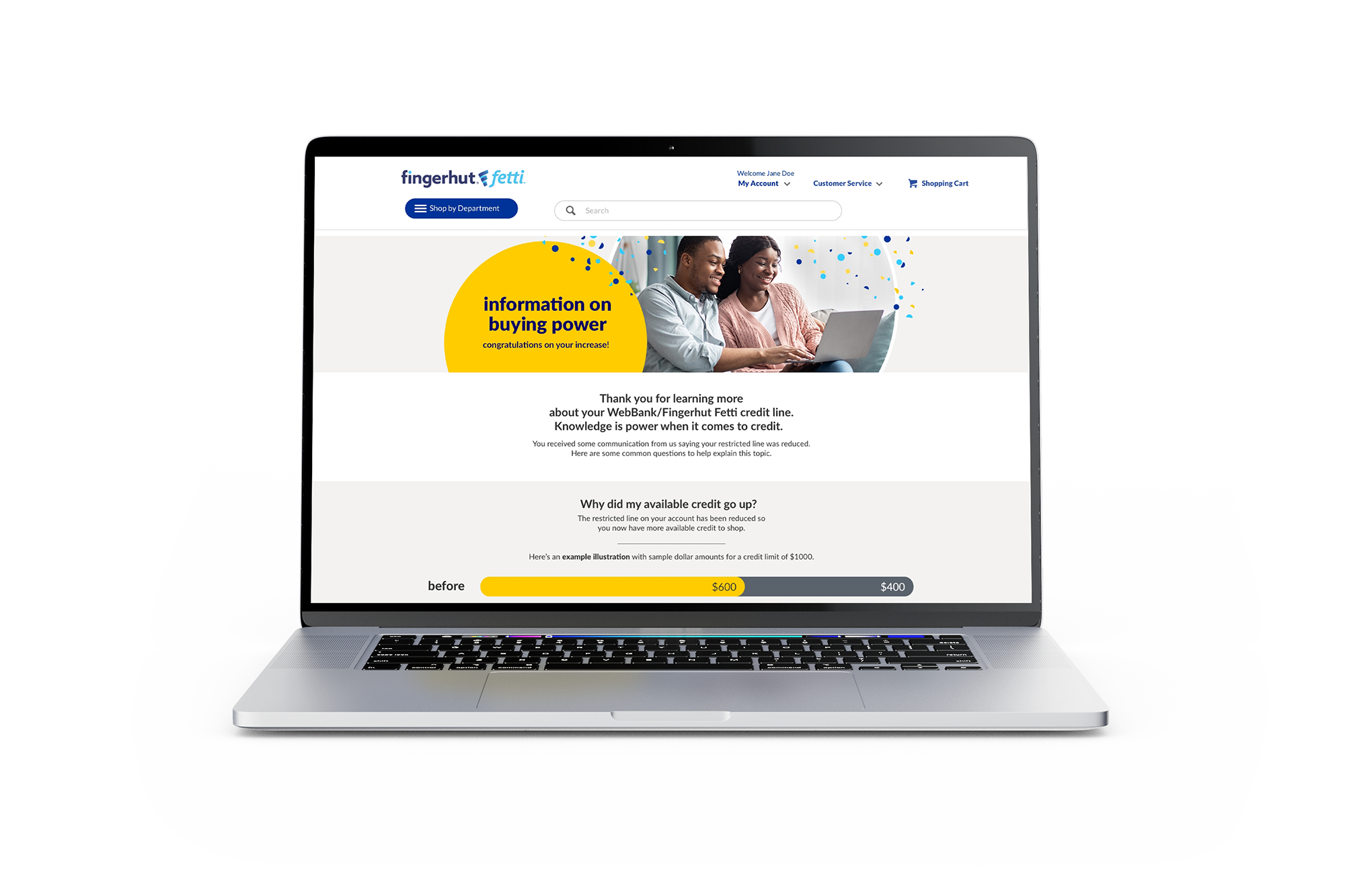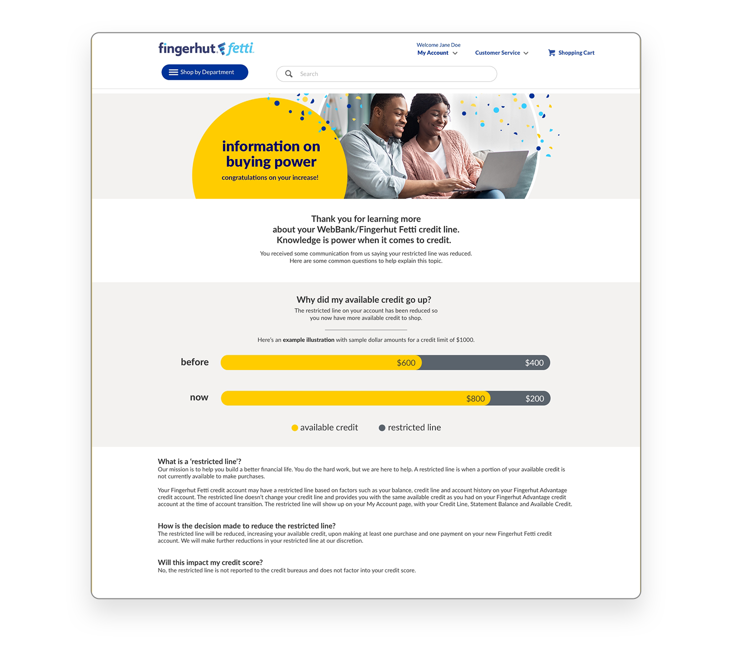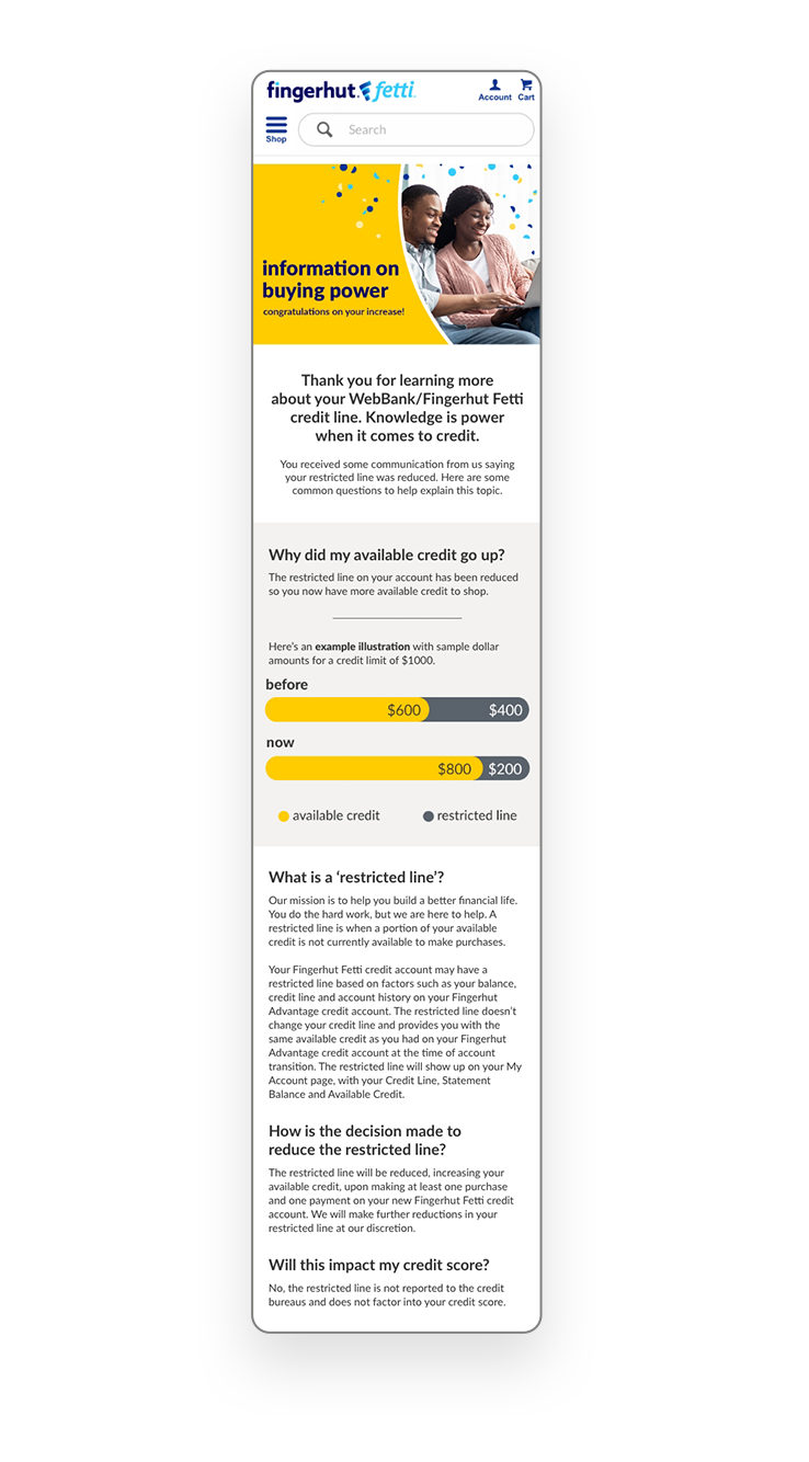 As part of Fingerhut’s credit product rebrand, we introduced a Restricted Line Increase (RLI) to help customers working to build their credit understand how their available credit could grow over time. Because this concept was complex, I developed a simplified digital experience that visually explained how a reduced restricted line could translate to increased buying power, empowering customers with clarity and confidence.